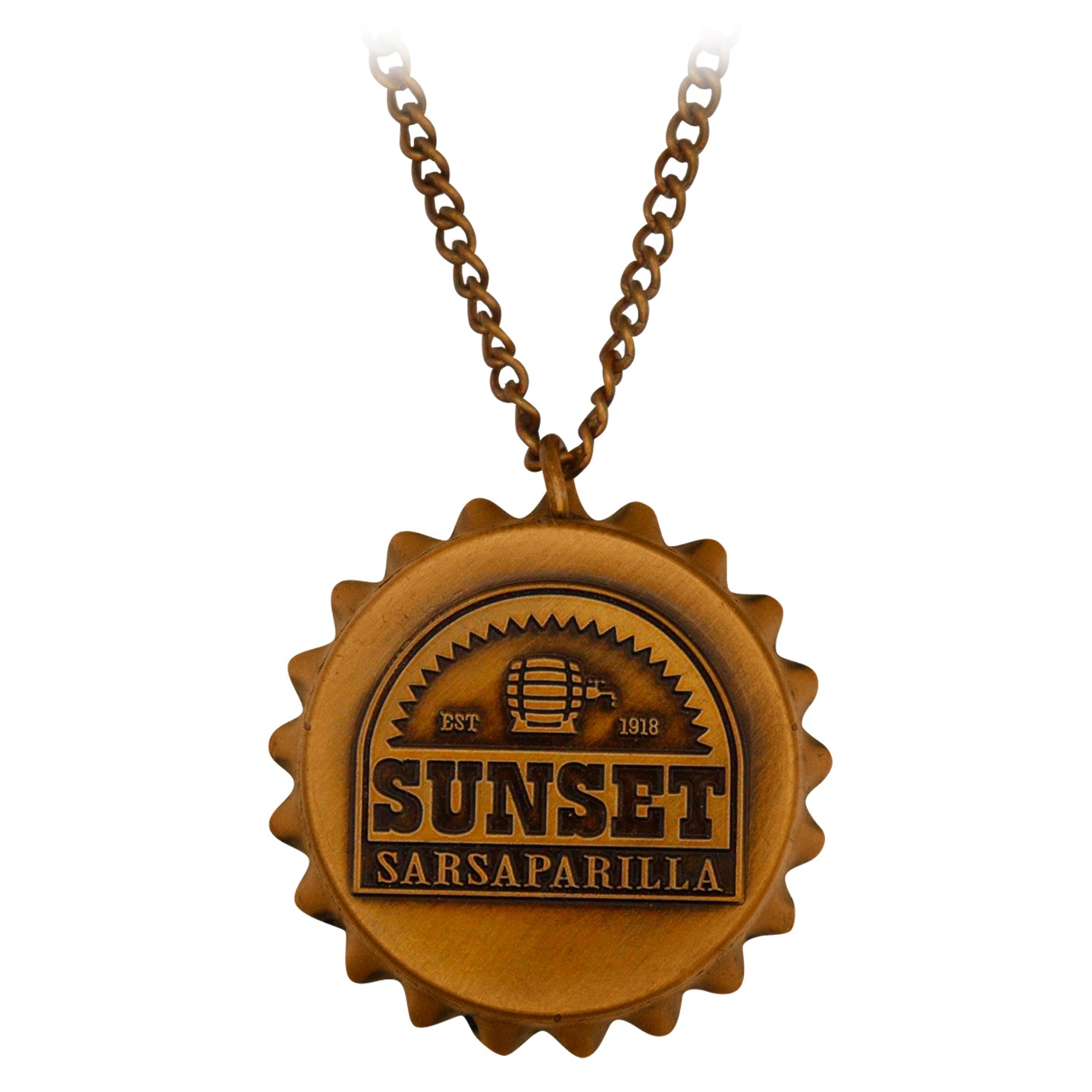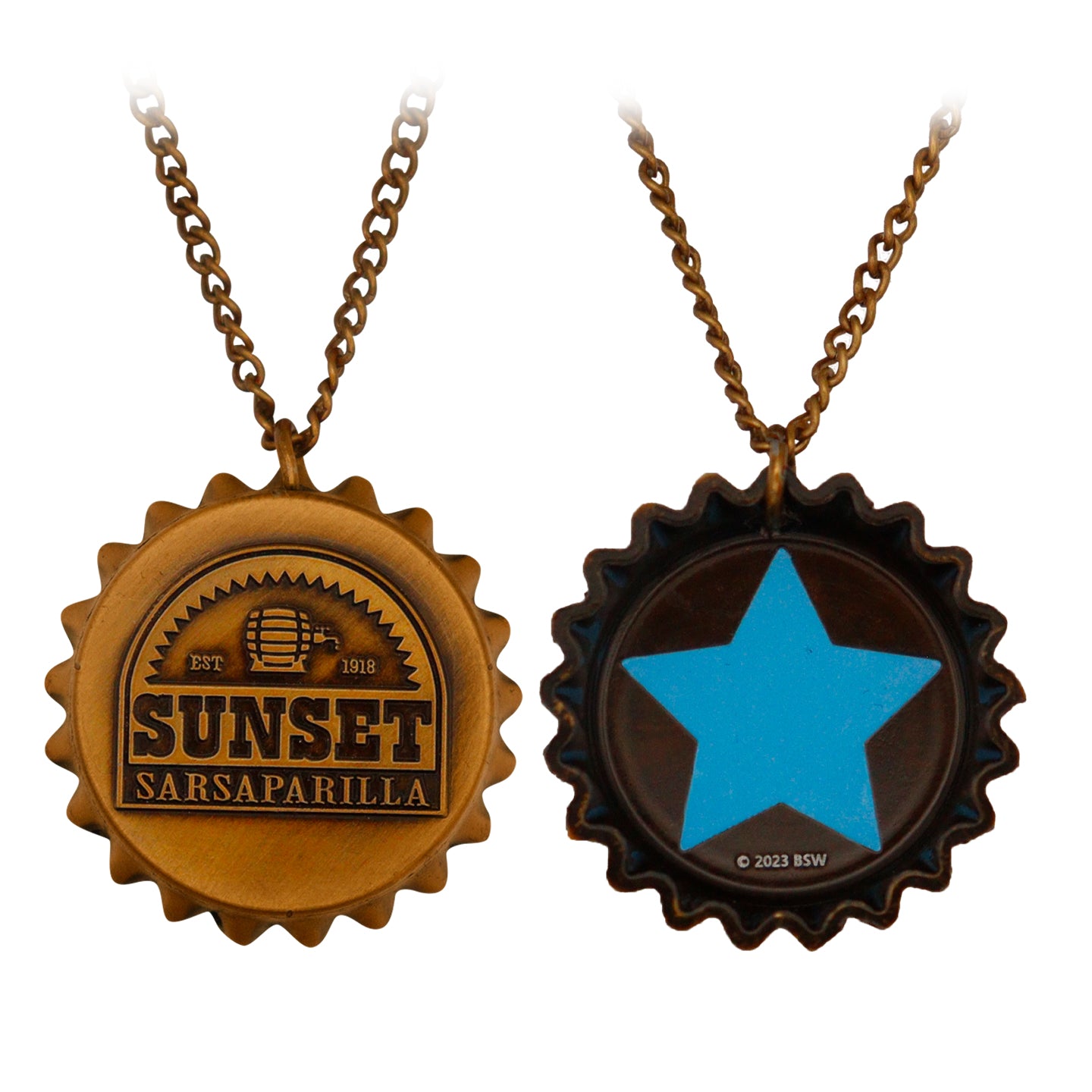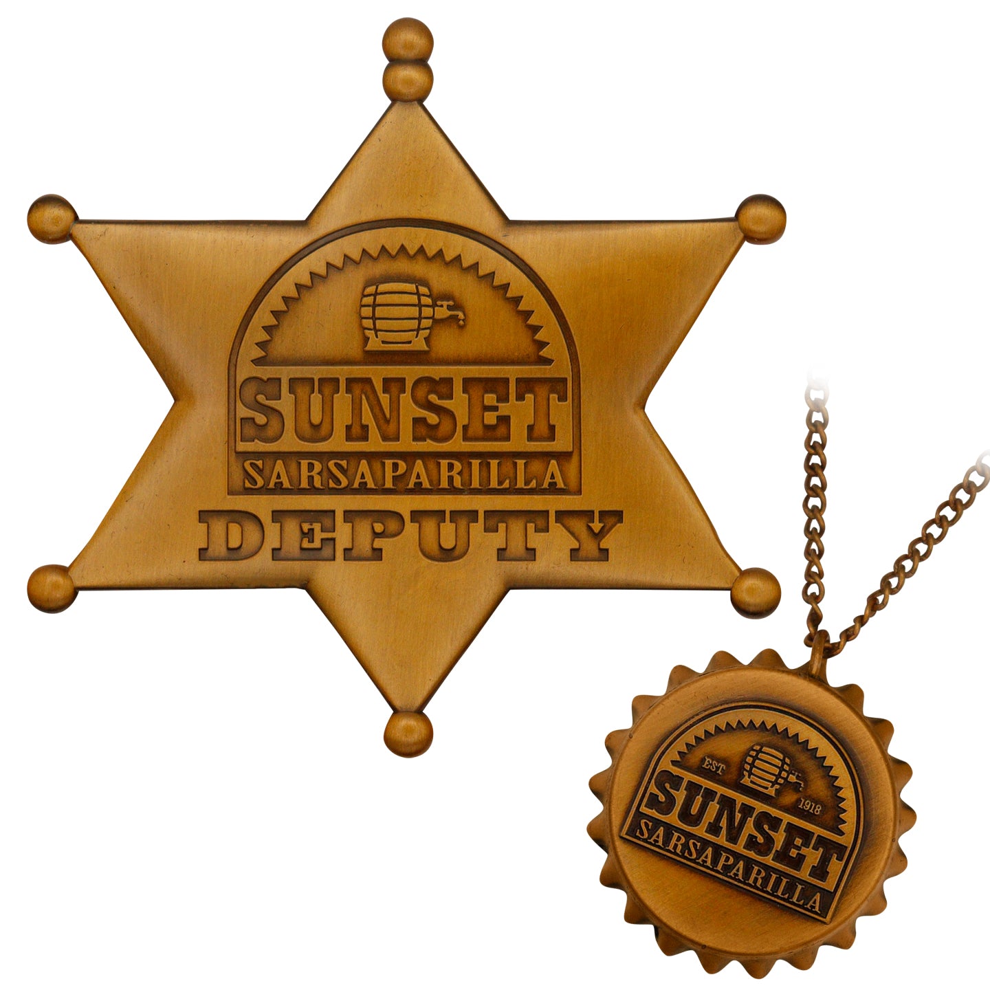 This limited edition Sunset Sarsaparilla the Legend of the Star Set, inspired by Fallout New Vegas includes a replica of the deputy badge you get for completing the Legend of the Star quest followed by the A Valuable Lesson quest, plus a Sunset Sarsaparilla bottle cap in necklace form (with a glow-in-the-dark blue star on the reverse), and an ace of spades depicting Festus (the robot that gives you the quests).